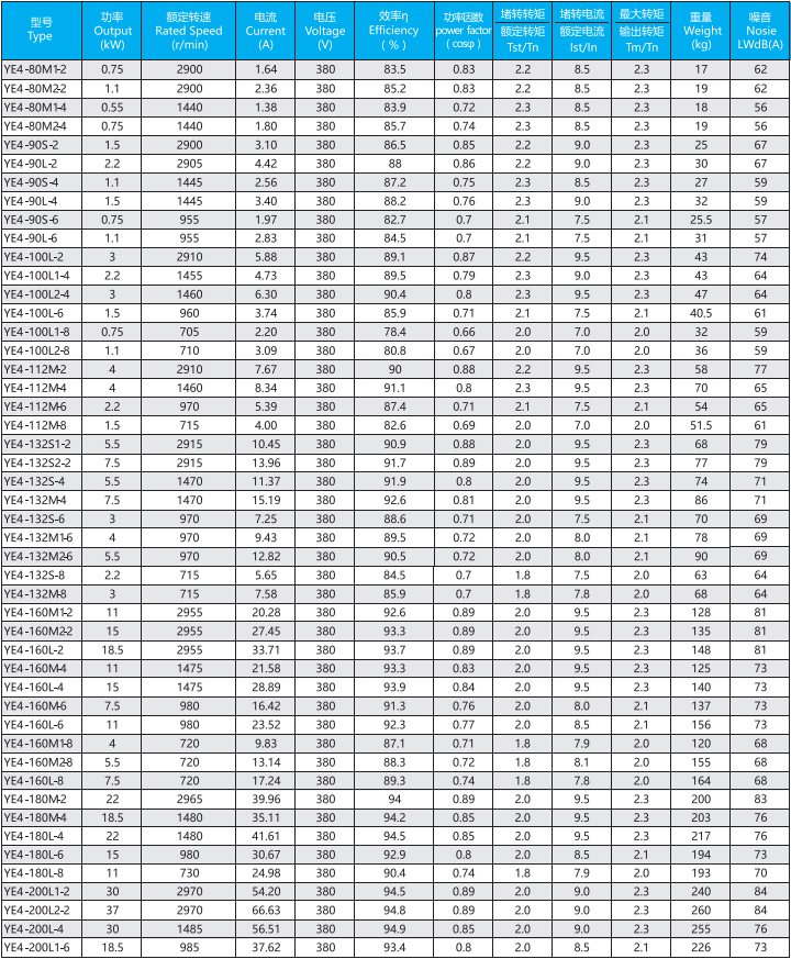 YE4系列(中心高H80-355mm、0.55-375kW)電動(dòng)機(jī)是全封閉、自扇風(fēng)冷式鼠籠型三相異步電動(dòng)機(jī),產(chǎn)品能效與IEC60034-30的IE4保持一致。一般電壓為380V、頻率為50HZ也可按客戶要求定制。工作環(huán)境-15-40℃海拔不超過1000m,絕緣等級(jí)F(B極考核)、防護(hù)等級(jí)IP55、冷卻方式IC411、工作制S1、安裝方式符合IEC和DIN標(biāo)準(zhǔn)。YE4系列電動(dòng)機(jī)為一般用途的電動(dòng)機(jī),適用于驅(qū)動(dòng)無特殊要求的各種機(jī)械設(shè)備。YE4系列電動(dòng)機(jī)滿足GB18613-2020能效限值2級(jí)。